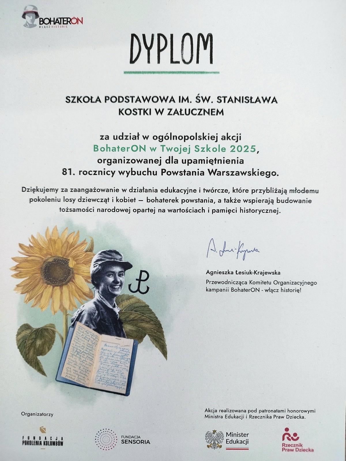 BohaterON – włącz historię! to ogólnopolska kampania mająca na celu upamiętnienie i uhonorowanie uczestników Powstania Warszawskiego oraz promocję historii Polski XX wieku. Po raz kolejny w akcji uczestniczyła nasza szkoła. Uczniowie klasy 8 z zainteresowaniem obejrzeli materiały przygotowane przez organizatorów akcji. Nowe informacje, dane i zdjęcia z okresu powstania poszerzyły ich wiedzę na ten temat. Ponadto wzięli udział w akcji "Dumni z Powstańców" https://wpis.dumnizpowstancow.pl/ i dodali swoje wpisy na stronie projektu.